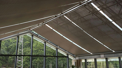 開合模式:單開、雙開 效果:天棚簾完全展開后,面料呈現均勻的波浪效果 應用場所:大中型的遮陽場所,廣泛應用于賓館、寫字樓等大型采光屋頂,用于調光節能、保持室內溫度,避免強光輻射,改善采光效應等。